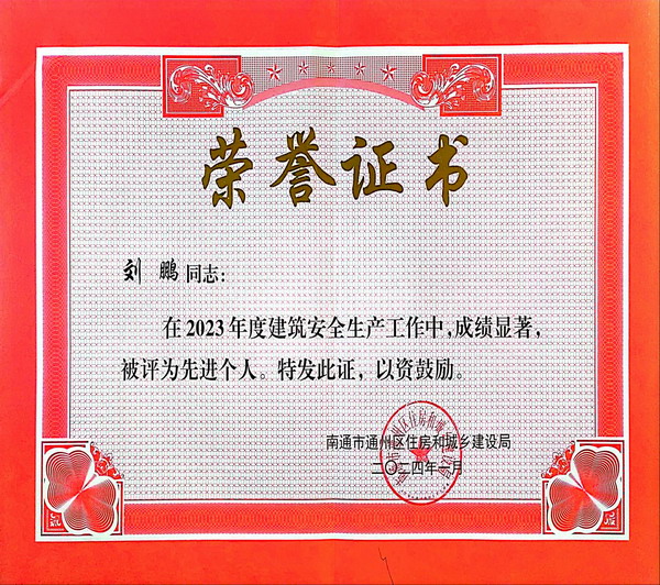 2023年在集團(tuán)董事會(huì)的正確引領(lǐng)和各分公司及項(xiàng)目部的共同努力下,我們嚴(yán)格遵守安全生產(chǎn)法律法規(guī),堅(jiān)持“安全第一、預(yù)防為主”的理念,認(rèn)真履行企業(yè)安全生產(chǎn)主體責(zé)任,開(kāi)展了形式多樣的安全生產(chǎn)管理,將隱患治理放在首位,把隱患消滅在萌芽狀態(tài),做到五落實(shí)、五到位,成績(jī)顯著。被通州區(qū)住房和城鄉(xiāng)建設(shè)局評(píng)為2023年度“先進(jìn)集體”。 三分公司的劉鵬被區(qū)住建局評(píng)為“先進(jìn)個(gè)人”。
